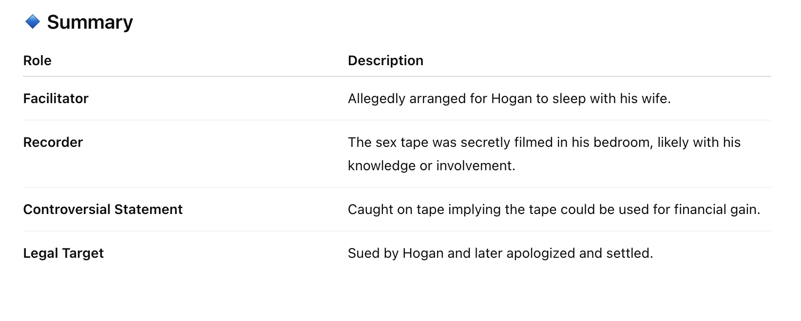 Bubba’s involvement amplified the sense of personal betrayal and privacy violation in the Hogan saga. His actions helped Hogan argue that the sex tape was never meant to be public, strengthening the case against Gawker and ultimately contributing to the historic legal judgment that reshaped digital journalism and privacy law.