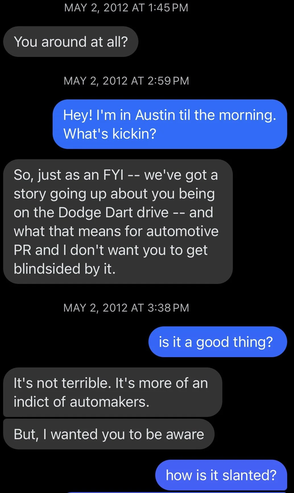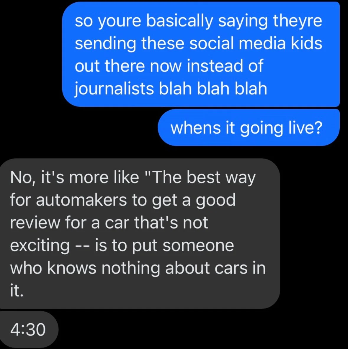 The week before, I had gotten a message in social from an editor of a big car blog.