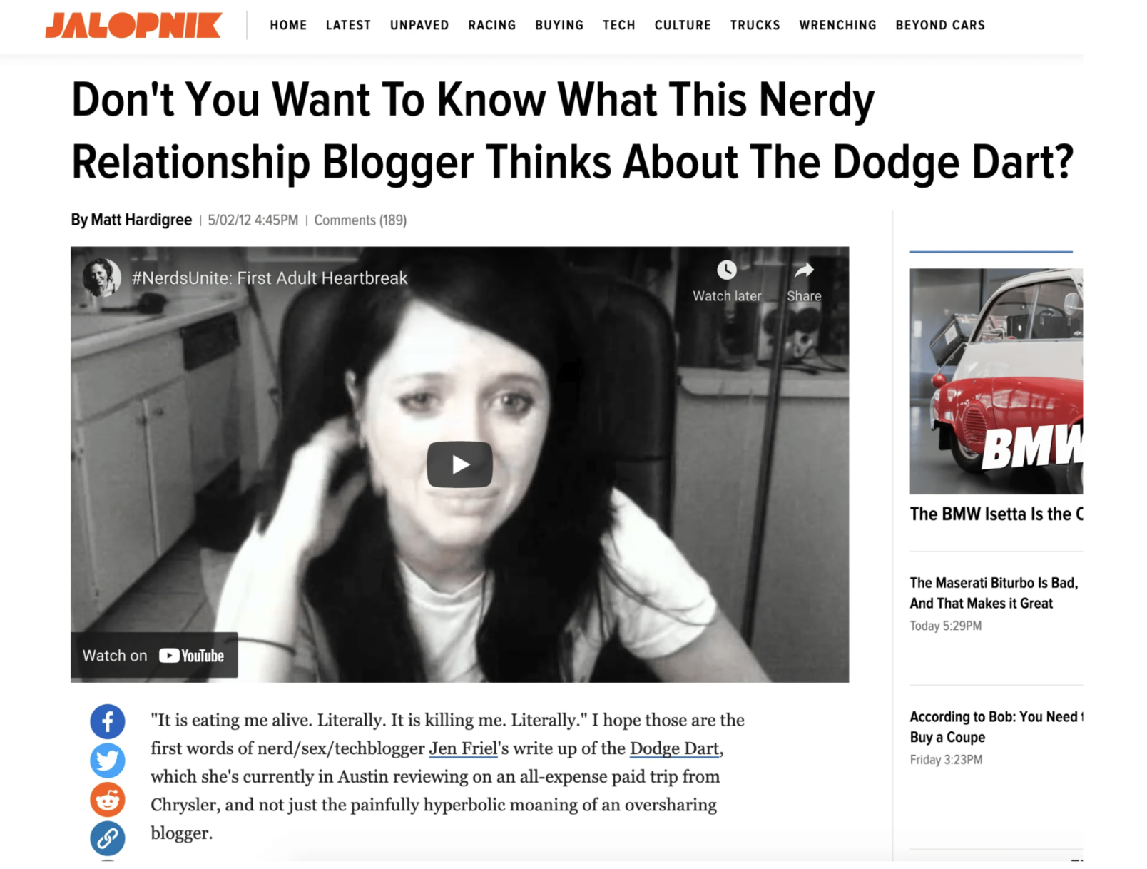 The 20 something other bro-culture-esque male journalists ALL wanted to know who I was and why the hell Jalopnik would write such a scathing piece.
