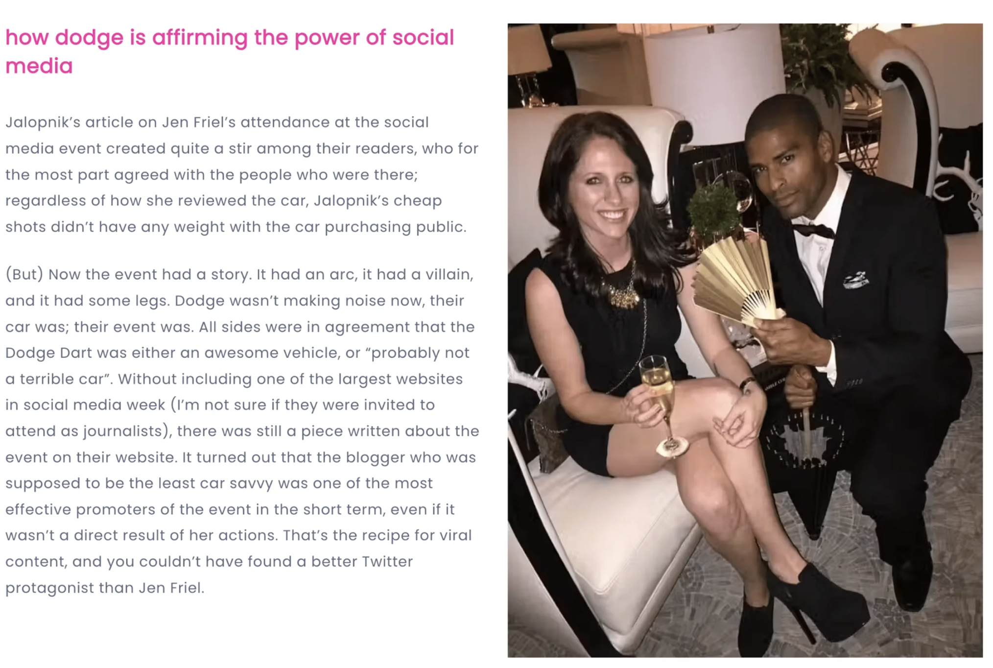 In May of 2012, I was at a car event for the Dodge Dart. Having been part of the Ford Fiesta Movement, I was often invited to go to media events (non-paid but they did include travel and stay).