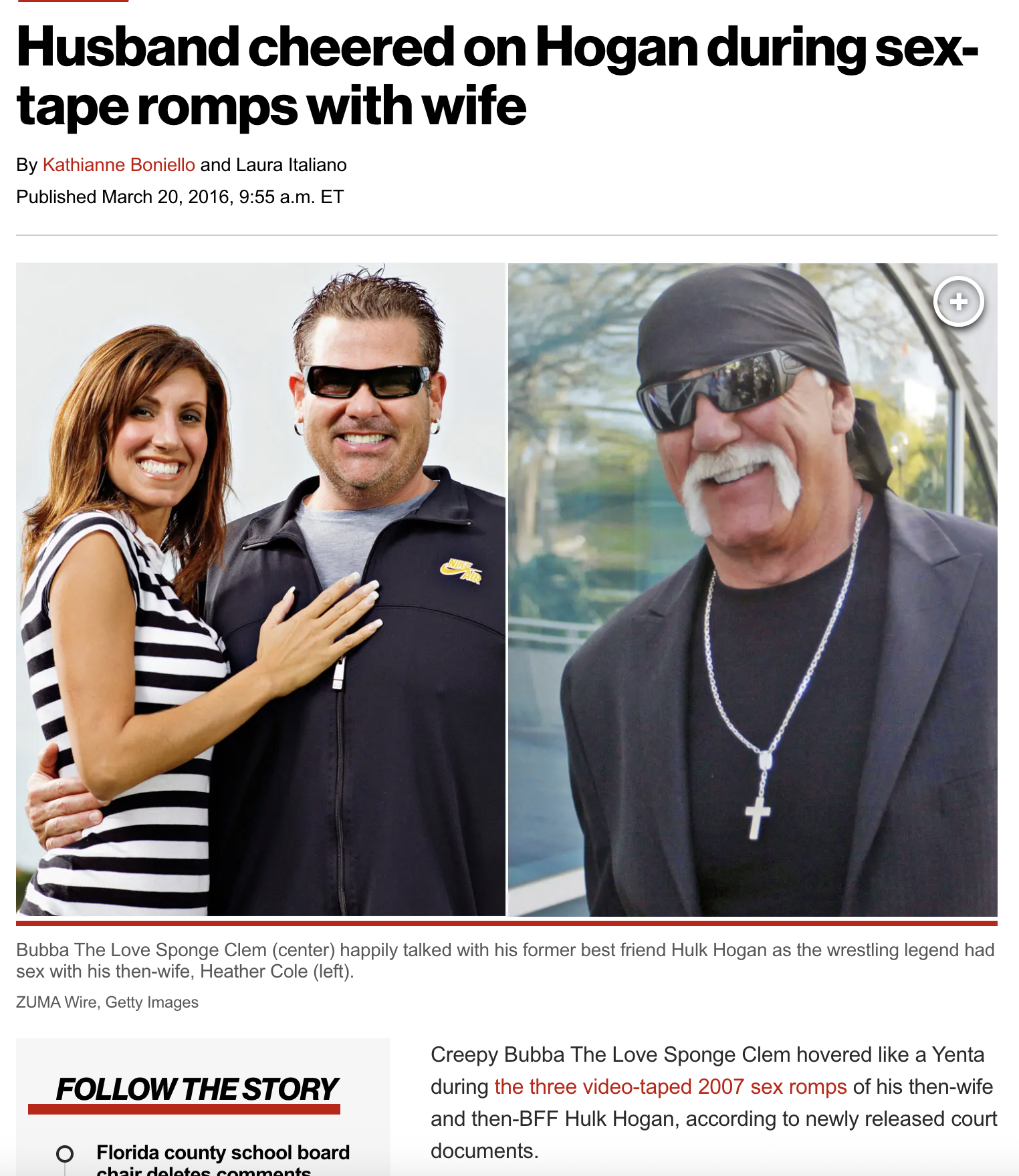 Hogan had sex with Bubba’s then-wife, Heather Clem.